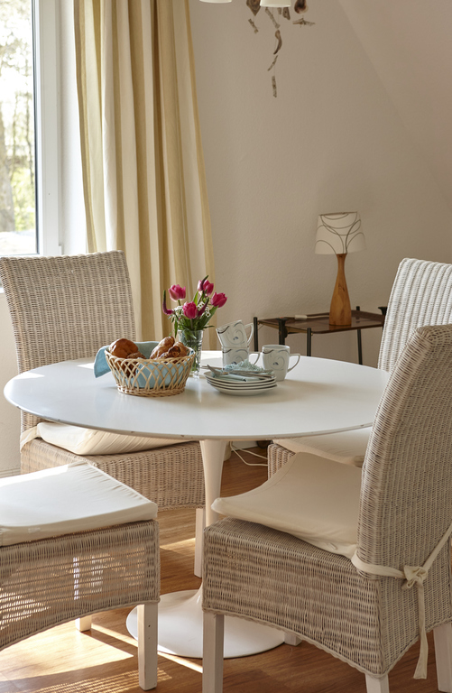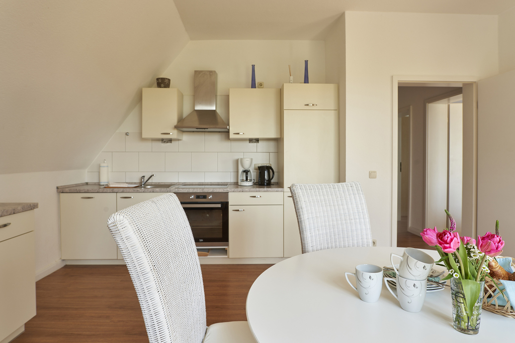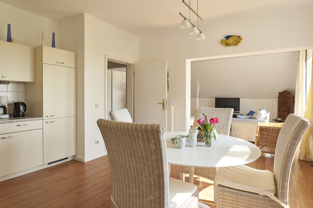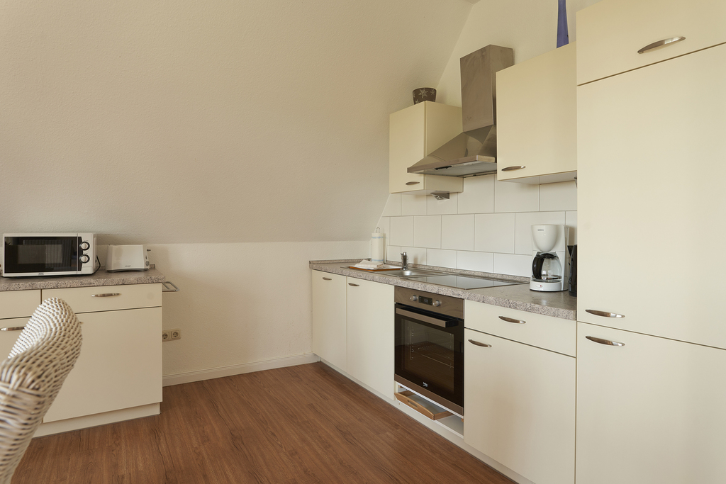 Die offen Küche mit Essplatz ist ausgestattet mit: Herd mit Backofen, Dunstabzugshaube, Geschirrspüler, Kühlschrank mit Eisfach, Mikrowelle, Toaster, Kaffeemaschiene, Wasserkocher.